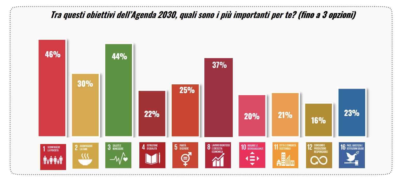 Tra gli Obiettivi dell’Agenda 2030 di carattere sociale, le giovani e i giovani ritengono prioritari i Goal 1, 3 e 8, che si riferiscono rispettivamente alla lotta alla povertà, a salute e benessere, e al lavoro dignitoso. In particolare, su quest’ultimo tema il 78% ritiene che le istituzioni non facciano abbastanza per promuovere l’occupazione giovanile, anche se il 53% apprezza l’impegno verso lo smart working e il lavoro flessibile.