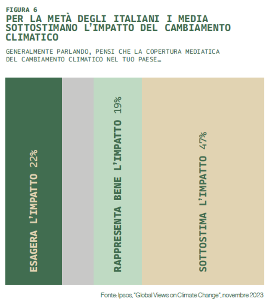 Secondo i dati, la fiducia degli italiani verso i media è bassa e solo il 22% ritiene di essere adeguatamente informato sugli impatti climatici. I mezzi di comunicazione sono percepiti come poco etici e poco competenti e non riescono a soddisfare la domanda di una comunicazione accurata ed equilibrata: il 47% degli intervistati ritiene infatti che sottovalutino l’impatto del cambiamento climatico, mentre il 22% li accusa di esagerarlo.