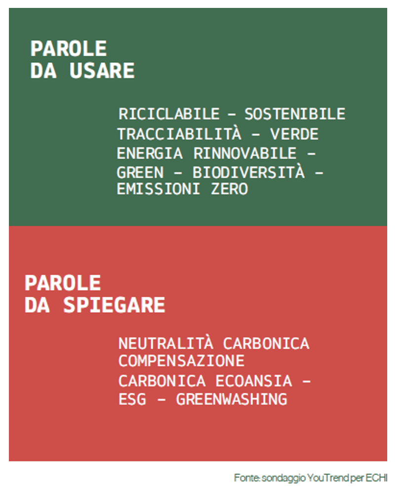 Un altro dato relativo alla comunicazione che emerge dall’indagine, è quello sulle parole della sostenibilità “unificanti” o “divisive”: le tre parole più unificanti risultano essere riciclabile, sostenibile, tracciabile, mentre ecoansia quella più divisiva. Più in generale, la ricerca rileva che è la mancata conoscenza dei concetti più specifici a rendere determinate parole più divisive.