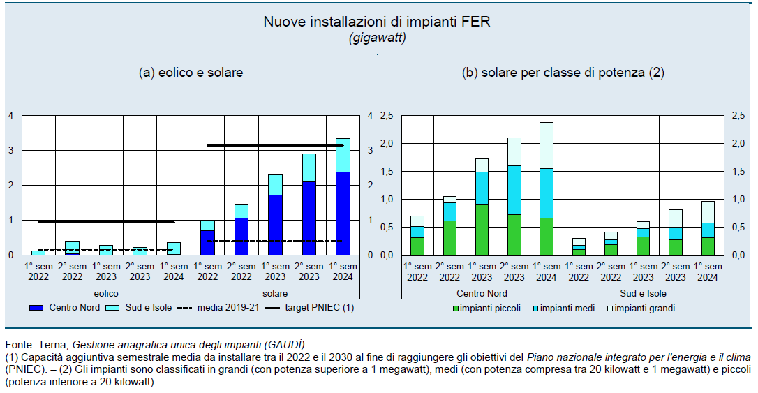 Dopo il periodo di stallo iniziato nel 2014, dal 2022 l’installazione di rinnovabili ha registrato un incremento notevole, con il fotovoltaico in prima linea. Nel 2023, secondo i dati di Terna, società proprietaria della Rete di trasmissione nazionale (Rtn) di energia elettrica, sono stati installati 5,2 GW di nuova capacità solare, più del doppio rispetto all'anno precedente, con oltre il 70% degli impianti concentrati nel Centro-Nord. Nel primo semestre del 2024, l’aggiunta di 3,3 GW segna un ulteriore aumento, del 40%, rispetto allo stesso periodo del 2023.