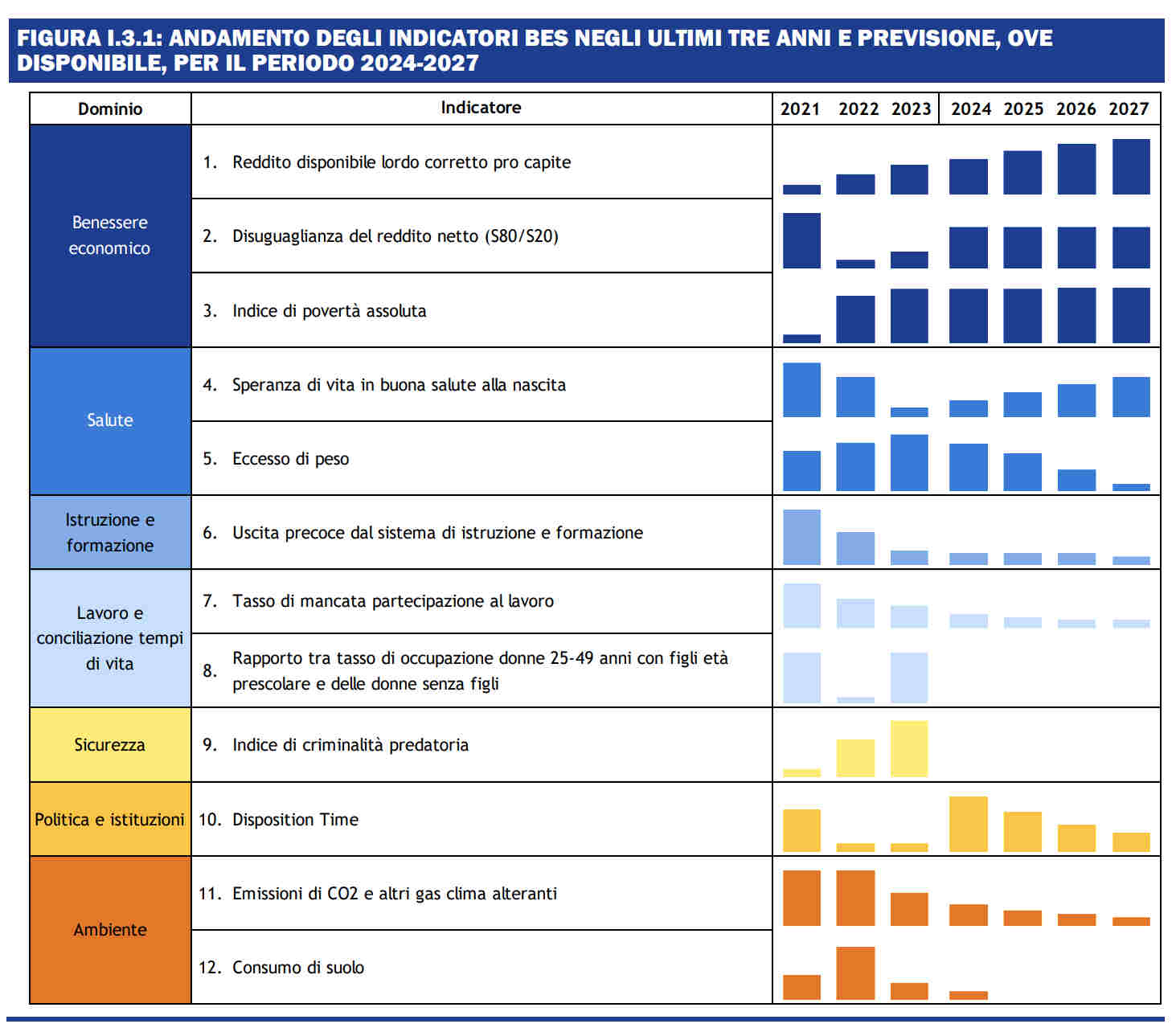 All’inizio di marzo, il Ministero dell’economia e delle finanze ha presentato la nuova Relazione sul Bes (Benessere equo e sostenibile), offrendo un’analisi dello stato di salute del sistema economico e sociale italiano. Il documento, redatto in collaborazione con l’Istat, aggiorna l’andamento dei 12 indicatori di cui si compone il Bes , con dati al 2023, e formula previsioni per otto di essi - Reddito disponibile lordo corretto pro capite, Disuguaglianza del reddito netto, Tasso di mancata partecipazione al lavoro, Emissioni di CO2 e altri gas climalteranti, Indice di povertà assoluta, Speranza di vita in buona salute alla nascita, Eccesso di peso, Uscita precoce dal sistema di istruzione e formazione - per il quadriennio 2024-2027, alla luce degli effetti attesi della Legge di bilancio 2025.