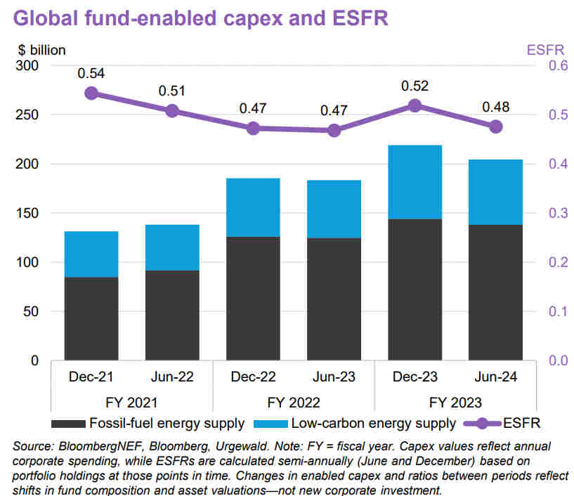 Per ogni dollaro speso in conto capitale - cioè spese per infrastrutture, impianti, tecnologie - dai fondi di investimento in asset petroliferi, di gas naturale o di carbone, solo 48 centesimi sono investiti in tecnologie a basse emissioni di carbonio. Lo rivela l’ultima analisi di Bloombergnef (Bnef) contenuta nel rapporto pubblicato lo scorso 11 giugno, l’Energy supply fund-enabled capex ratio (Esfr), in cui sono stati valutati quasi 70mila fondi attraverso l’introduzione di un nuovo parametro - l’Esfr - capace di misurare l'allineamento “climatico” dei portafogli.