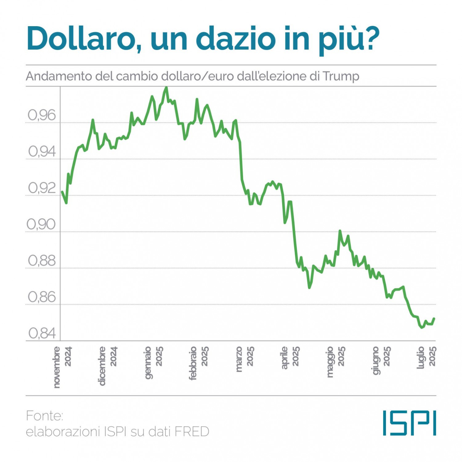 In questo scenario di dazi medi al 15%, l’Ispi prevede un impatto in termini negativi dello 0,3% sul Pil tedesco, dello 0,2% su quello italiano, e dello 0,1% sul Pil francese. Ma i problemi per l’export europeo non terminano con i dazi. “A pesare ulteriormente sui prodotti Ue venduti negli Stati Uniti contribuisce anche l’andamento del tasso di cambio dollaro-euro. Dall’insediamento di Trump (20 gennaio) a oggi, il dollaro ha perso il 13% del suo valore rispetto all’euro”, spiega infatti l’Istituto. Si tratta dunque di una sorta di dazio aggiuntivo, dato che il deprezzamento del dollaro costringe gli esportatori a “scegliere tra mantenere invariati i prezzi in dollari abbassando quelli in euro (e dunque i propri ricavi), o rischiare di perdere competitività”.