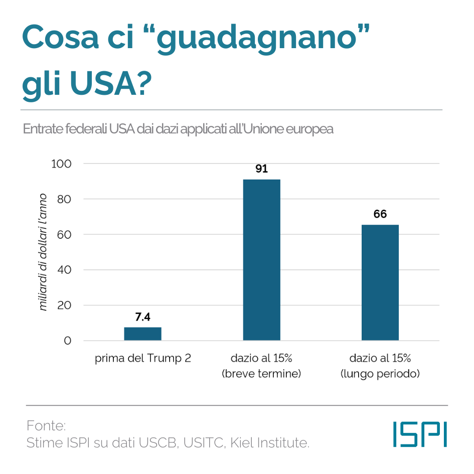 I dazi sulle merci europee potrebbero far crescere le entrate fiscali degli Stati Uniti fino a 91 miliardi di dollari l’anno, partendo dai sette miliardi dell’era pre-Trump. Ma se, come indicano i principali modelli macroeconomici, le esportazioni europee verso il mercato americano dovessero calare del 25–30%, il gettito effettivo si fermerebbe attorno ai 66 miliardi. Una cifra comunque considerevole: si tratta di quasi nove volte superiore a quella di partenza.