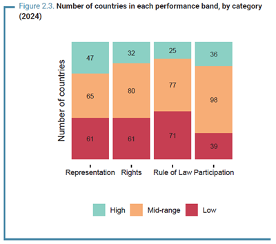 Nel confronto tra il 2024 e il 2019, quattro sono state le categorie prese in esame: rappresentanza, diritti, stato di diritto e partecipazione. Tra queste, 71 Paesi (il 41%) rientrano nella fascia di performance bassa per quanto riguarda lo stato di diritto, mentre in termini di rappresentanza, 47 Paesi (il 27%) hanno ottenuto punteggi elevati nel 2024. Tuttavia, si sono osservati numerosi cali nelle categorie elezioni credibili e Parlamento efficace.