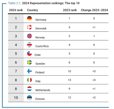 Tra i primi 10 Paesi in termini di performance sulla rappresentanza per il 2024, Germania, Danimarca e Norvegia continuano a guidare la classifica a livello mondiale, mentre Mauritius fa registrare un notevole miglioramento, salendo di 23 posizioni in classifica. Questi Paesi sono in contrasto con le tendenze globali più ampie del 2024, che indicano l’andamento più basso dal 2001 in termini di rappresentanza. Sono stati registrati infatti cali in 21 Paesi, la maggior parte dei quali avevano già in passato una bassa performance.