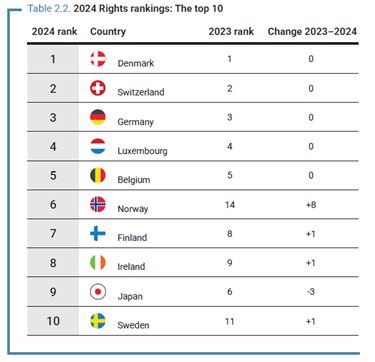 Un piccolo gruppo di Paesi continua a essere all'avanguardia nella tutela dei diritti. Come illustrato nella Tabella 2.2, Danimarca, Svizzera e Germania hanno occupato le prime tre posizioni nel 2024, mantenendo una performance stabile, mentre Paesi come Norvegia, Irlanda e Svezia hanno registrato notevoli miglioramenti.