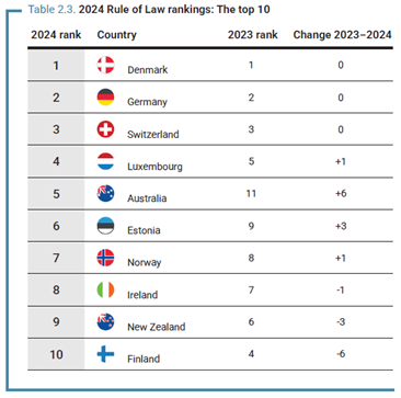 Nonostante le diffuse sfide allo Stato di diritto a livello globale, diversi Paesi continuano a stabilire standard elevati in questo ambito. Questi Paesi dimostrano punti di forza costanti in termini di indipendenza giudiziaria, bassi livelli di corruzione, applicazione prevedibile della legge e solide tutele contro la violenza politica.