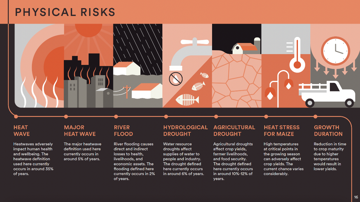 I rischi fisici. Secondo il paper, le principali fonti di rischio “fisico”, già nel 2050, includono la possibilità di grandi ondate di calore e siccità, che influiranno pesantemente sul settore agricolo – in particolare sulle colture di mais, che si vedranno sottoposte a un forte stress termico e registreranno una riduzione della crescita annuale. Ad esempio, nel caso di un aumento di circa 3°C rispetto alla temperatura attuale si registrerà una probabilità maggiore del 30%-40% di incorrere in una forte ondata di calore entro il 2050, rispetto a uno scenario che si attesta intorno ai 2°C. Allo stesso modo, lo stress termico per il mais aumenterebbe di oltre il 50% in regioni chiave come la Russia, l'Unione europea e il Regno Unito, determinando riduzioni della resa comprese tra il 20 e il 30%, rispetto a un incremento di 2°C. Al contrario, mantenendosi entro 1,5°C di riscaldamento, si avrebbero una probabilità inferiore al 15% di grandi ondate di calore, una frequenza inferiore al 10% di lunghi periodi di stress termici per la coltura del mais e una riduzione del 10% della durata della sua crescita, rispetto a uno scenario a 2°C.