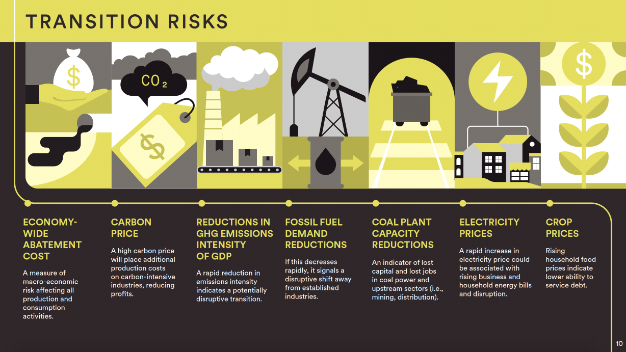 Questa ricerca mette in correlazione una serie di indicatori (fisici e di transizione) per una gamma di differenti percorsi di emissioni di gas serra, che possono condurre a un aumento della temperatura, entro la fine del secolo, compreso tra 1,5° e 4°C – utilizzando i 2°C come “caso di riferimento efficace”, un benchmark sulla cui base confrontare i rischi di temperature inferiori (1,5°C) o superiori (2,5°C-4°C).