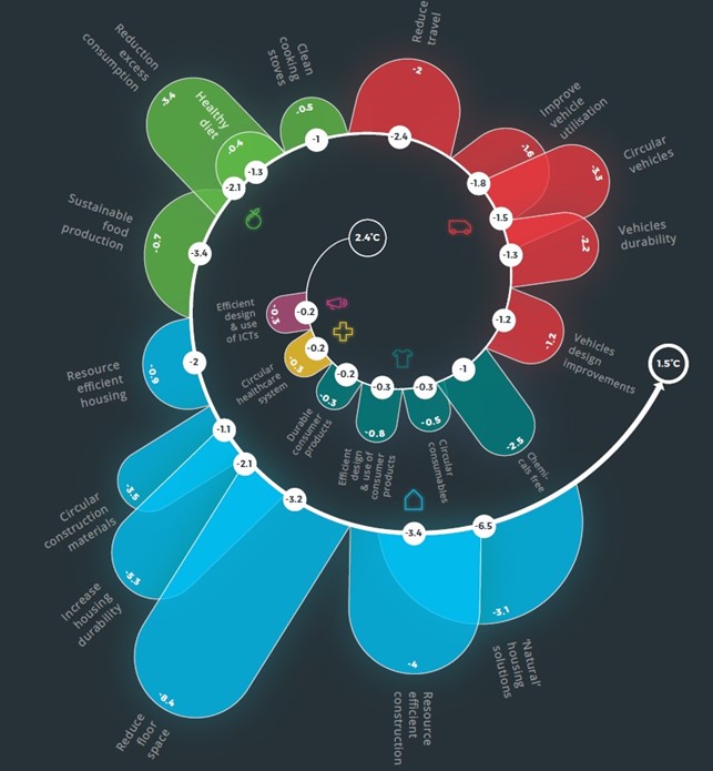 In ambito alimentare, ridurre i consumi, sostituendo ad esempio il mangime per animali con sottoprodotti agricoli lavorati e utilizzare meno plastica negli imballaggi, porterebbe un risparmio di 2,7 Gt di emissioni e 3,40 Gt di materia. Anche la produzione di cibo sostenibile, come alimenti biologici e di stagione, consumo di cibo locale e fresco, ci aiuterebbe a risparmiare 2,07 Gt di emissioni e 3,40 Gt di materiali. Produrre beni consumabili sostituendo i prodotti chimici con le bioplastiche o riducendo i prodotti chimici, comporterebbe un risparmio di 0,96 Gt di emissioni e 2,50 Gt di consumo di materiale.