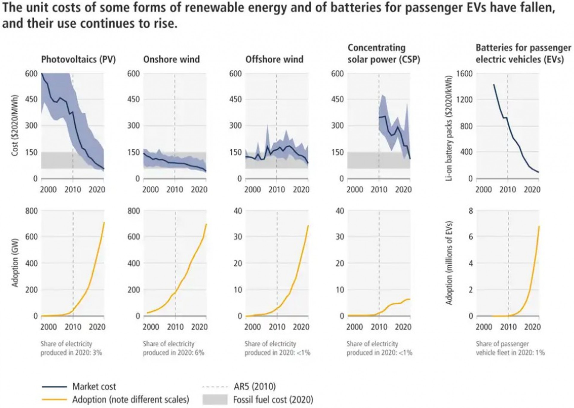 Passiamo alle “buone notizie” del Rapporto. Nonostante i tempi siano incredibilmente stretti, anche e soprattutto per via dei decenni persi, le soluzioni per mettere in sicurezza il benessere della popolazione globale e dei nostri ecosistemi ci sono. In tutti i settori sono infatti disponibili opzioni in grado di dimezzare le emissioni entro il 2030. In quello energetico, lo sforzo di riduzione passerà per una sostanziale rinuncia ai combustibili fossili. La parola d’ordine è elettrificazione del sistema energetico, alimentato dalle rinnovabili e accompagnata da una serie di combustibili alternativi e di misure basate sul risparmio e l’efficienza energetica. Da annotare, in positivo, che dal 2010 al 2019 i costi relativi al fotovoltaico e ad altre fonti pulite sono andati velocemente giù, diventando in molti casi più competitivi dei combustibili fossili (la fascia grigia dei grafici in alto della seguente immagine mostra il costo delle tecnologie fossili, in blu il drastico calo dei costi delle tecnologie a basse emissioni). Si sono infatti verificate diminuzioni dei costi dell’energia solare dell’ordine dell’85%, dell’energia eolica del 55%, delle batterie a litio dell’85%. Anche per questo motivo, sono cresciute le loro distribuzioni, per esempio la produzione di energia alimentata dal Sole e i veicoli elettrici sono aumentati in un numero pari a 10 e 100 volte nell’ultimo decennio.
