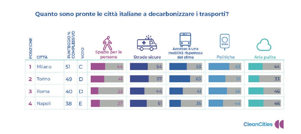 - l’altro sulla Campagna europea Clean Cities, con un City Ranking tra 36 grandi città europee in cui sono comprese quattro città italiane: Milano, Torino, Roma e Napoli. A confronto la mobilità attiva, il trasporto collettivo, le politiche per migliorare la qualità dell’aria e ridurre le emissioni, la sicurezza sulle strade, gli spazi pedonali, da cui si evince che le città italiane sono nella parte bassa della classifica.