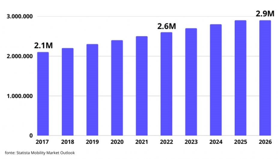 Dati simili, ma leggermente più incoraggianti, si riscontrato per il bike sharing, il servizio di mobilità che si basa sulla prenotazione e condivisione delle biciclette tramite app. Secondo alcune ricerche presentate nel Mobility Market Outlook del portale tedesco Statista e riportate da Internet-casa, il numero di persone che utilizza questo sistema di mobilità in Italia è in costante crescita: dai due milioni del 2017 ai 2,6 milioni nel 2022, che potrebbero arrivare fino a 2,9 milioni nel 2026.