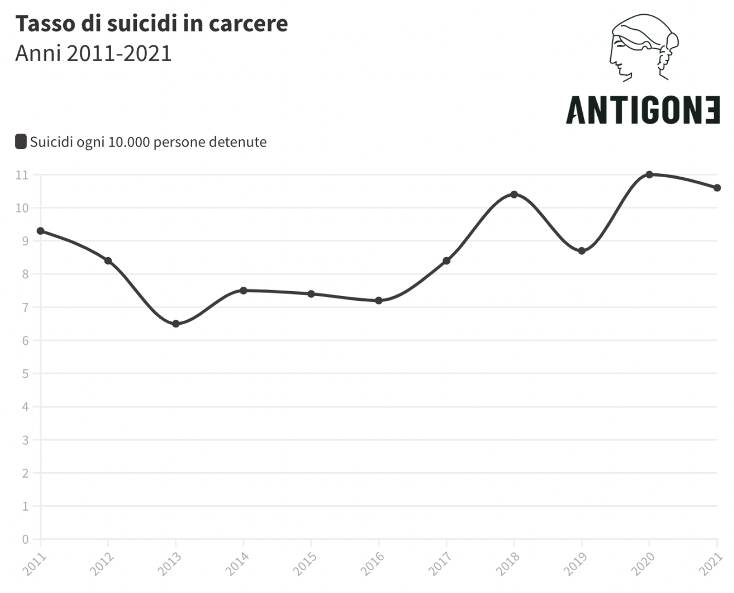 Il tasso di suicidi in carcere. Un primo elemento fondamentale è quello del tasso di suicidi in carcere, ossia il rapporto tra il numero di suicidi e le persone mediamente presenti negli istituti di pena nel corso dell’anno: nel 2021, a fronte di una presenza media di 53.758 detenuti, si è attestato a 10,6 casi ogni 10mila persone detenute.