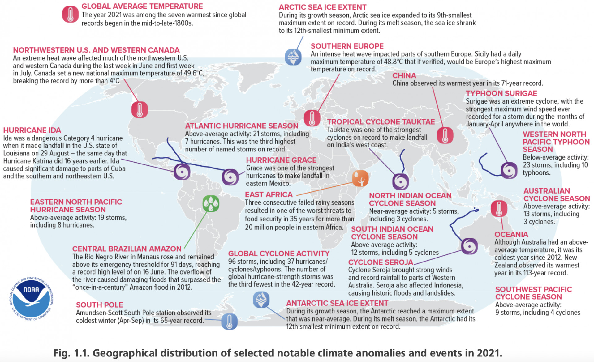 Il Rapporto, inoltre, fa il punto sulle anomalie e sugli eventi meteorologici che sono stati osservati da un capo all’altro del Pianeta e che fungono da sentinella dell’avanzamento del riscaldamento globale. La mappa sottostante riporta la distribuzione geografica dei principali fenomeni climatici registrati nel 2021.