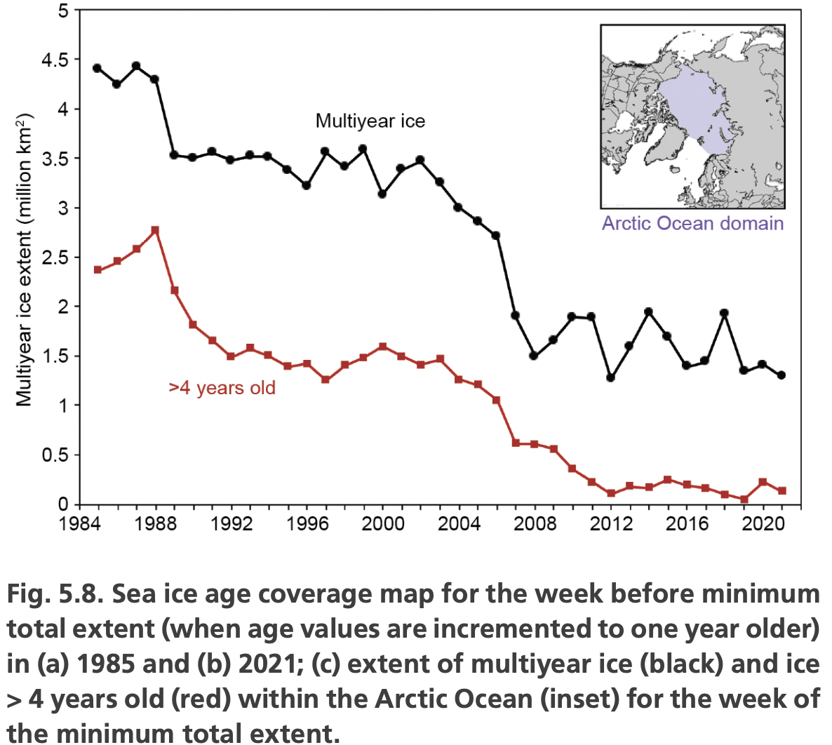 - Artico: sempre più “giovane e sottile”. Nel 2021, il tredicesimo anno più caldo nei 122 anni di registrazioni artiche, è stata rilevata la seconda più bassa quantità di ghiaccio pluriennale (che sopravvive ad almeno una stagione di scioglimento estivo). Come mostra il grafico, nell’Artico il ghiaccio più vecchio di oltre quattro anni è diminuito del 94% dall’inizio delle rilevazioni.