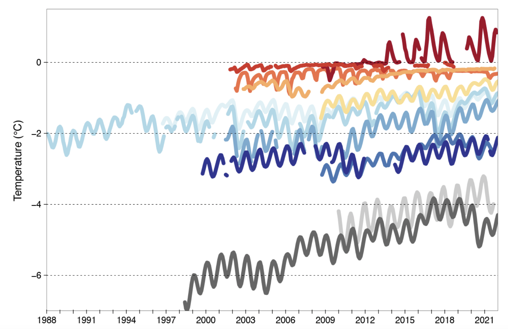A livello globale i ghiacciai hanno perso massa per il 34esimo anno consecutivo e le temperature del permafrost — un terreno diffuso nelle zone che raggiungono temperature sotto lo zero e che rimane congelato per 2 anni consecutivi — hanno continuato a raggiungere valori record: nel grafico la linea rossa indica l’andamento crescente delle temperature rilevate nelle Alpi europee e nei Paesi nordici in profondità. Un fenomeno che preoccupa gli scienziati del clima poiché il permafrost, sciogliendosi, rilascia nell’ambiente un contenuto ricco, tra l’altro, di gas metano.