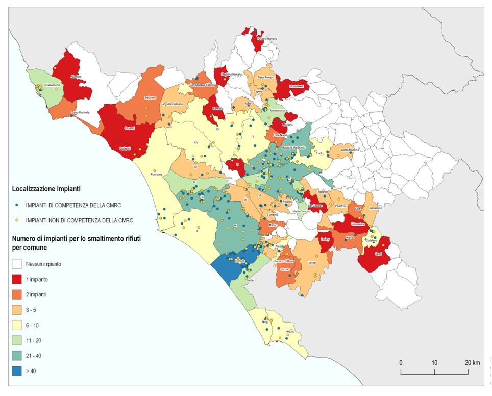 Figura 9.12 Impianti per lo smaltimento dei rifiuti nella Città metropolitana di Roma Capitale. Fonte: Elaborazione CURSA da Città metropolitana di Roma Capitale