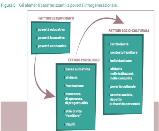 Povertà ereditaria: “i pavimenti e soffitti appiccicosi”. In Italia per le persone che si trovano nelle posizioni più basse della scala sociale si registrano scarse possibilità di accedere ai livelli superiori (mobilità ascendente), a differenza di chi proviene da famiglie avvantaggiate. Viene chiamata “povertà intergenerazionale” o “ereditaria” e si usa l’espressione dei “pavimenti appiccicosi” (sticky grounds) e dei “soffitti appiccicosi” (sticky ceilings). La Caritas ha condotto un’indagine tra i suoi beneficiari per quantificare la cosiddetta “povertà intergenerazionale” e rilevare i fattori che determinano la trasmissione. Oltre la metà dei casi intercettati nel 2021 sono di povertà ereditaria (da ben tre generazioni) per lo più nelle isole (65,9%) e nel Centro (64,4%). Tra i nati da genitori senza alcun titolo, quasi un beneficiario su tre si è fermato alla sola licenza elementare, circa un figlio su cinque ha mantenuto la stessa posizione occupazionale del padre e il 42% occupa un livello ancora più basso nella scala sociale (mobilità discendente). Sebbene più di un terzo abbia vissuto la mobilità ascendente, ciò non corrisponde sempre a un adeguato inquadramento contrattuale e retributivo. In Italia occorrono cinque generazioni affinché una persona che nasce da una famiglia povera possa raggiungere un livello di reddito medio. Come mostra il grafico, i fattori che caratterizzano la povertà intergenerazionale sono di varia natura.
