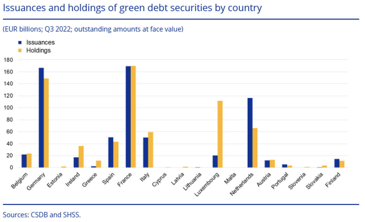 Indicatori sperimentali sulla finanza sostenibile. Forniscono una panoramica degli strumenti di debito verde, sociali, sostenibili o legati alla sostenibilità. Francia e Germania sono i principali emittenti e detentori di titoli di debito verde, con oltre la metà del mercato. I Paesi Bassi sono il terzo emittente e il Lussemburgo è il terzo detentore. I restanti Paesi dell'area euro rappresentano una piccola quota sia delle emissioni che delle partecipazioni del mercato dei green bond.