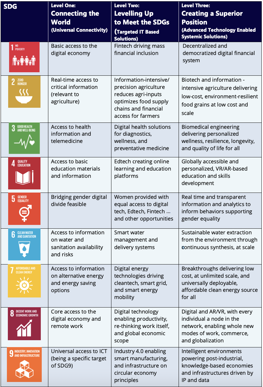 Il contributo della tecnologia. Promuovere la connettività globale e implementare le tecnologie digitali potrebbe accelerare il progresso verso gli SDGs del 20%, riducendo il costo per il raggiungimento degli Obiettivi di oltre 30mila miliardi di dollari. L'implementazione di soluzioni digitali può migliorare l'impatto sui singoli Obiettivi, riducendone il costo per il raggiungimento fino a 55mila miliardi di dollari.