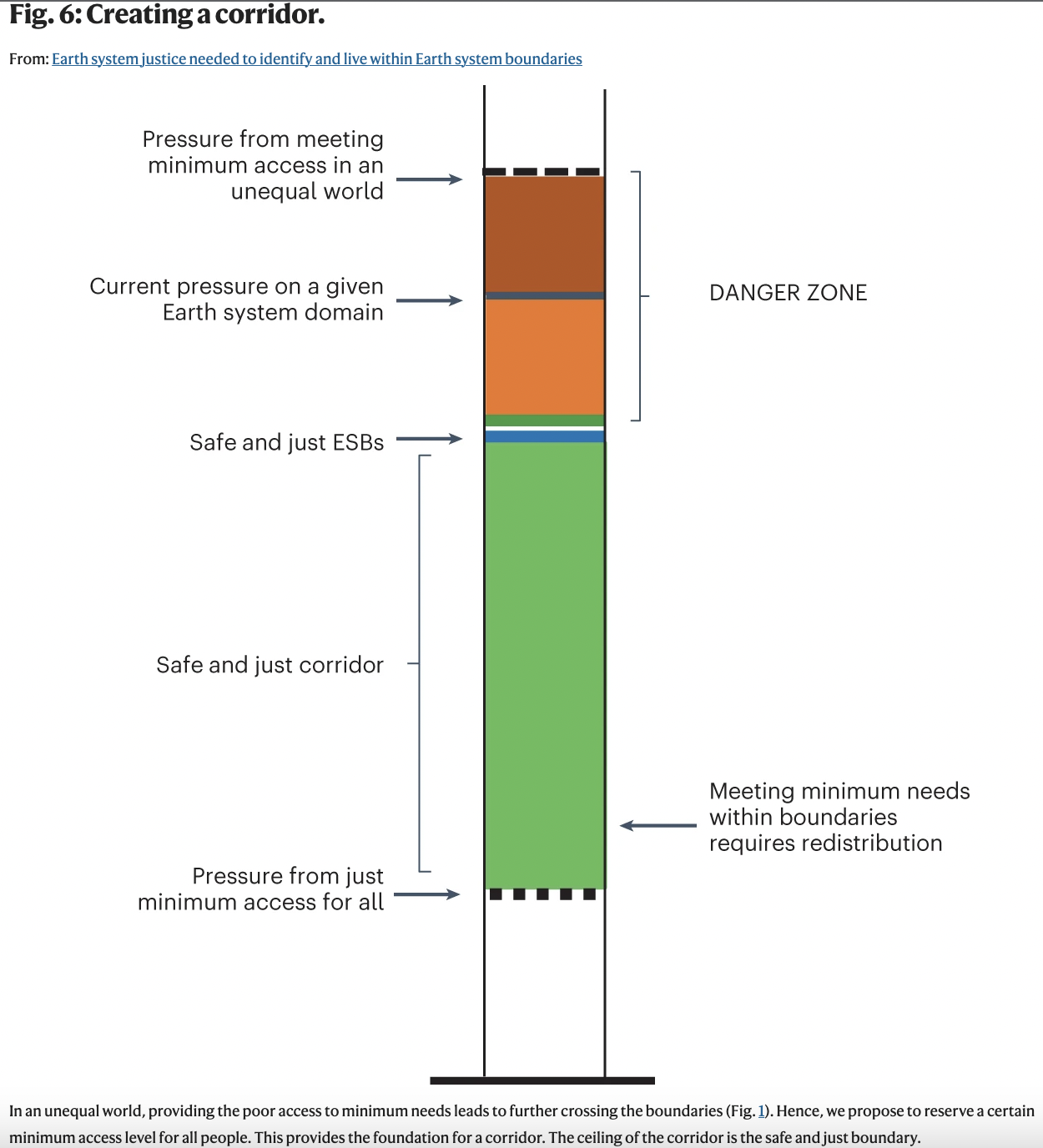 Il tutto è spiegato bene dalla seguente figura, che mostra in verde le emissioni annuali che possono essere considerate a un livello sicuro (che porterebbe a una probabilità del 50% di rimanere al di sotto dei 2°C di aumento medio della temperatura terrestre rispetto al periodo preindustriale); in arancione la pressione attuale esercitata sul confine climatico; in rosso ciò che implicherebbe il soddisfacimento dei bisogni minimi. Importante è la linea nera tratteggiata in alto: ci dice che in un mondo così diseguale, come quello odierno, se tutti uscissero dalla soglia di povertà sarebbe impossibile non superare il punto di non ritorno climatico.