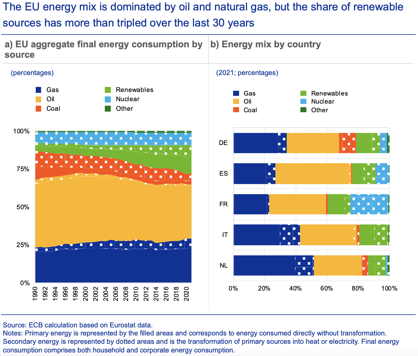 Il consumo aggregato di gas e petrolio è però rimasto relativamente stabile negli ultimi 30 anni, mentre la quota delle rinnovabili è triplicata e ha raggiunto quasi il 20% del consumo totale di energia, sostituendo principalmente il carbone. Il relativo calo del consumo diretto di fonti energetiche ad alta intensità di carbonio è stato compensato da un relativo aumento del consumo di elettricità (+17% negli ultimi 30 anni), derivante da una progressiva elettrificazione dei processi produttivi e degli edifici. Tra i cinque Stati più grandi dell’Ue, come si vede nella figura seguente, i Paesi Bassi e l’Italia fanno però ancora affidamento sui combustibili fossili per oltre l’80% del loro consumo energetico totale, mentre la Francia fa ampio uso dell’energia nucleare.