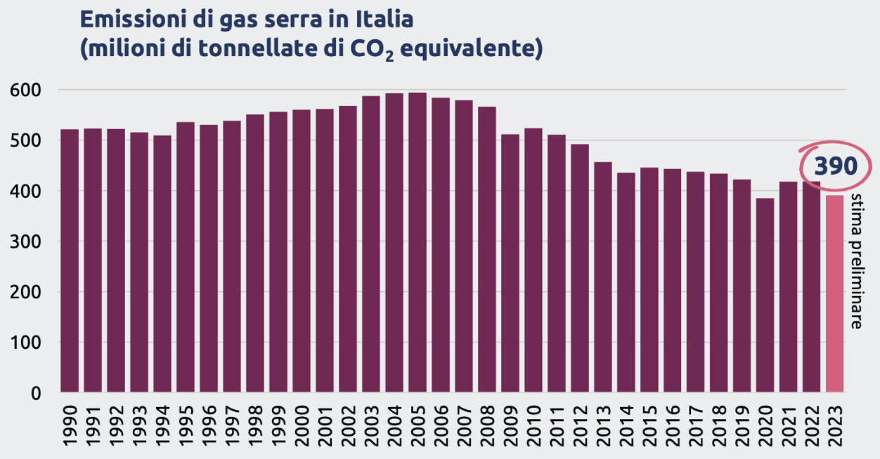 2. -6,5% di emissioni di gas serra, pari a circa 27 milioni di tonnellate. Secondo i dati dell’Enea e dell’Ispra si tratta della maggiore riduzione delle emissioni di gas serra dal 1990 ad oggi (escludendo gli anni di recessioni economica). Per centrare gli obiettivi europei al 2030, l’Italia dovrebbe tagliare ogni anno circa 20 milioni di tonnellate di gas serra.