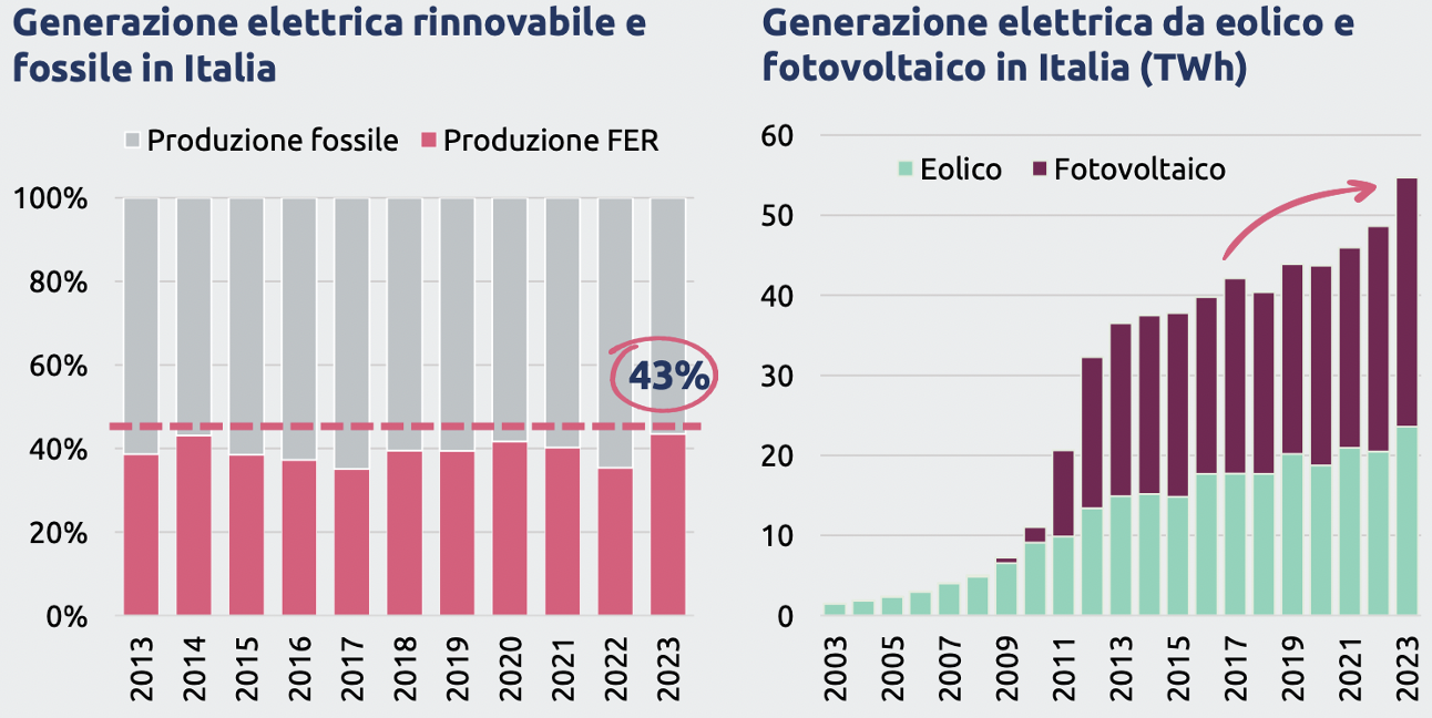 6. Rinnovabili elettriche. 20% è la quota di elettricità prodotta da fotovoltaico e eolico. La produzione elettrica da rinnovabili è tornata in linea con gli anni precedenti. L’insieme di tutte le rinnovabili elettriche sfiora il 44% della produzione. Crescono soprattutto eolico e fotovoltaico che per la prima volta nel 2023 hanno prodotto da sole quasi 55 TWh, più del 20% della produzione nazionale di elettricità.