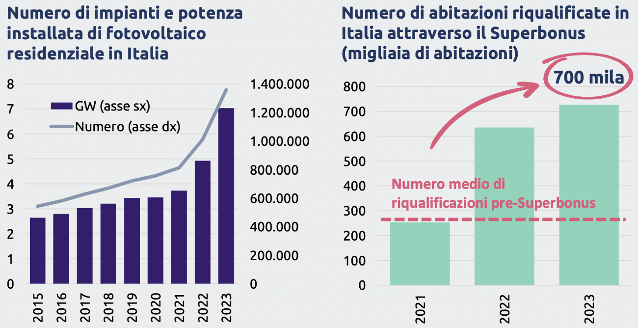 8. 700 mila sono gli edifici riqualificati con il Superbonus. A fine 2023 risultano installati in Italia più di 1,3 milioni di impianti fotovoltaici nel settore residenziale. In due anni è raddoppiato il fotovoltaico a servizio delle abitazioni. Per centrare gli obiettivi di decarbonizzazione dovremmo intervenire ogni anno su quasi un milione di abitazioni.