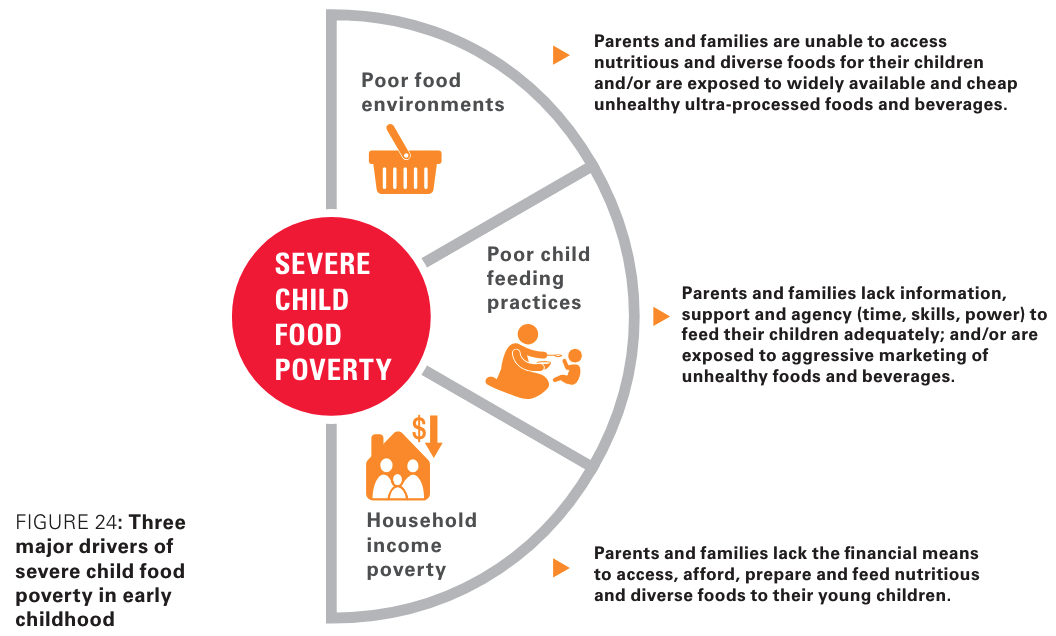 La povertà alimentare non è un fenomeno che riguarda solo i più poveri, colpisce infatti sia le famiglie meno abbienti che quelle più ricche: il 46% dei bambini in povertà alimentare grave proviene dai due quintili di ricchezza più bassi e il 54% da famiglie di ceto medio e alto. La maggior parte di questi bambini riceve solo latte materno, prodotti lattiero-caseari o alimenti ricchi di amido, con meno del 10% che consuma frutta e verdura e meno del 5% che consuma proteine animali. Cibi e bevande non salutari sono sempre più comuni nelle loro diete, a causa di sistemi alimentari che non riescono a fornire ai bambini opzioni nutrienti, sicure e accessibili, l'incapacità delle famiglie di permettersi alimenti nutrienti e l'incapacità dei genitori di adottare e sostenere pratiche positive di alimentazione dei bambini. In molti contesti, gli alimenti ultra-lavorati e le bevande zuccherate, a basso costo e poveri di nutrienti, sono commercializzati in modo aggressivo e per i genitori e le famiglie e rappresentano la nuova normalità per l'alimentazione dei bambini.