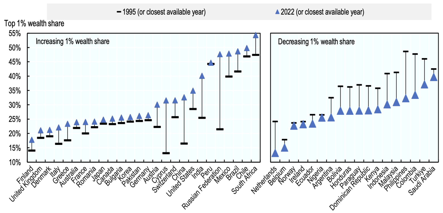 Dal report emerge una tendenza che attira sempre più l’attenzione della politica e della società civile: i più abbienti diventano sempre più ricchi. Si stima che tra il 1995 e il 2022 la ricchezza posseduta dallo 0,001% degli individui sia raddoppiata, passando dal 3,3% al 6,9%. Questo significa che la ricchezza dello 0,001% è circa 20 volte maggiore rispetto al 50% della popolazione più povera. In molti Paesi, evidenzia il Rapporto, la ricchezza è concentrata in mano a pochi. La quota di ricchezza posseduta dall'1% degli individui più ricchi nei vari Paesi varia da poco meno del 15% a più del 50%. Tra i Paesi analizzati, il Sudafrica ha il livello più alto di concentrazione della ricchezza, dove l'1% della popolazione detiene il 54,4% della ricchezza totale. Al contrario, nei Paesi Bassi, l’1% della popolazione detiene “solo” il 13,1% della ricchezza.