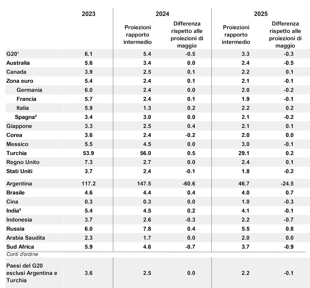 La crescita è stata salda in molti Paesi del G20, tra cui Stati Uniti, Brasile, India, Indonesia e Regno Unito. Secondo le proiezioni, la crescita annua del Pil negli Usa subirà un calo, che sarà attenuato dall'allentamento della politica monetaria, con una crescita prevista del 2,6% nel 2024 e dell'1,6% nel 2025. Anche le previsioni per la Cina indicano un rallentamento della crescita, che scenderà al 4,9% nel 2024 e al 4,5 % nel 2025. Nella zona euro, la crescita del Pil dovrebbe attestarsi allo 0,7 % nel 2024 e all'1,3 % nel 2025, condizione sostenuta dalla ripresa dei redditi reali e dal miglioramento della disponibilità di credito. La Germania è l’unico Paese della zona euro che registra risultati meno favorevoli, con il Pil che passa dallo 0,1% del 2024 all’1% del 2025. In miglioramento la Francia, che passa dall’1,1% del 2024 all’1,2% del 2025 e l’Italia, che passa dallo 0,8% del 2024 all’1,1% del 2025. “L’Italia, sta facendo relativamente bene in questo momento, con una crescita molto vicina al suo potenziale”, ha detto il capo-economista dell’Ocse, Alvaro Pereira.