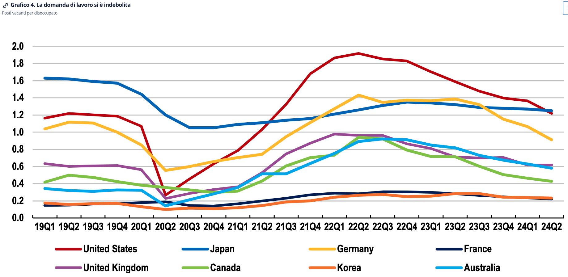 Si allentano le tensioni nel mercato del lavoro. Il Rapporto evidenzia che il numero di posti di lavoro vacanti per lavoratore disoccupato è diminuito costantemente ed è attualmente tornato ai livelli pre-pandemia. Le indagini continuano ad evidenziare che le carenze di manodopera sono più contenute in molte delle principali economie avanzate. La disoccupazione è aumentata dello 0,5% o più anche in Argentina, Canada, Sudafrica, Turchia e Stati Uniti. Una situazione in parte dovuta al rallentamento della domanda che, a sua volta, frena la crescita dell'occupazione.