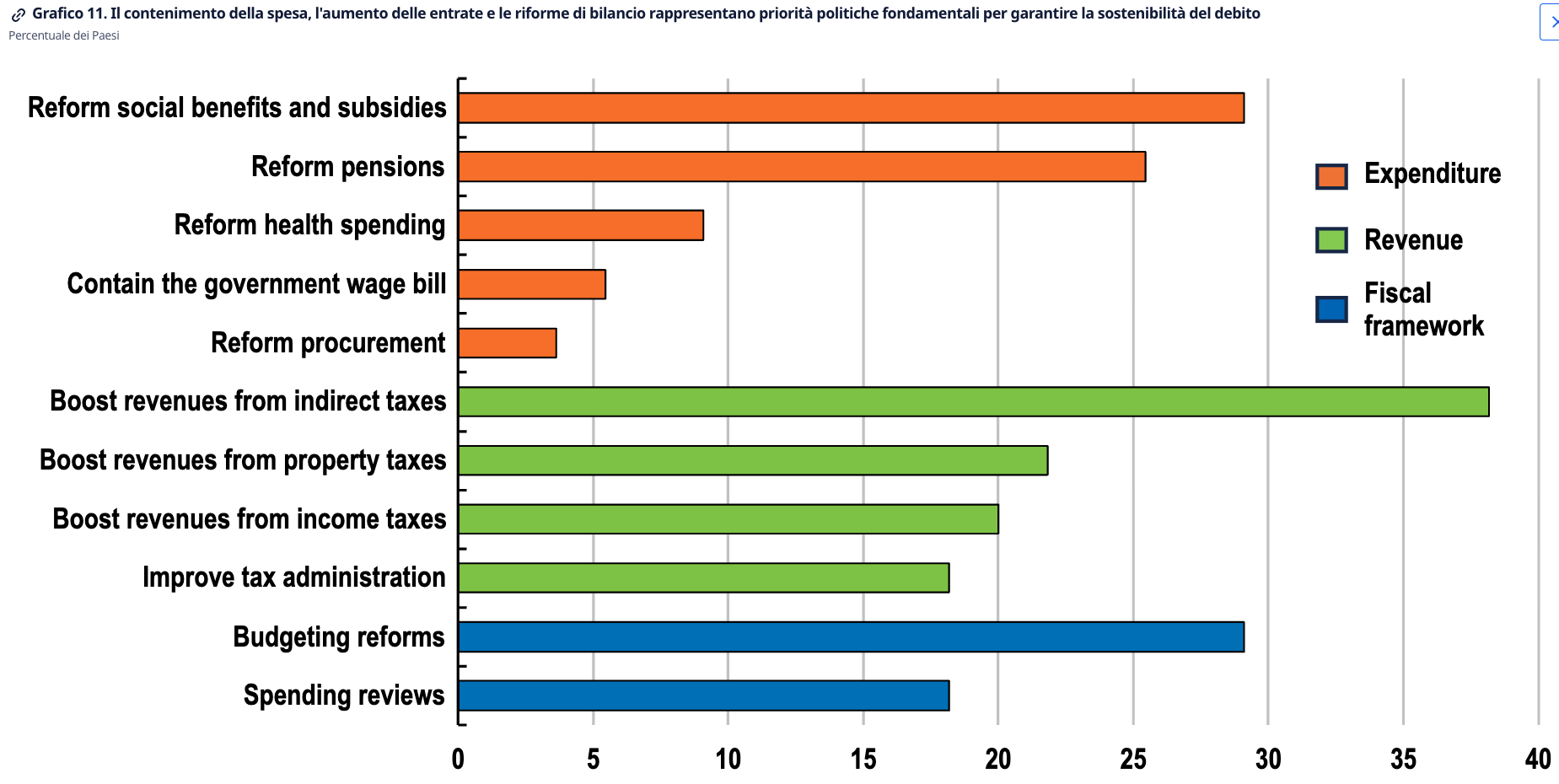 Occorrono azioni fiscali incisive per garantire la sostenibilità del debito, lasciare ai governi un margine di manovra per reagire agli shock futuri e generare risorse per contribuire a far fronte alle future pressioni sulla spesa. Al fine di garantire la stabilizzazione dell'onere del debito, è fondamentale compiere maggiori sforzi per contenere la spesa e migliorare le entrate. È necessario, conclude il Rapporto, il rilancio di riforme del mercato dei prodotti che promuovano l'apertura dei mercati con dinamiche competitive sane. Un passo essenziale per incentivare una crescita economica più forte e sostenuta e attenuare le pressioni di bilancio sul lungo periodo.