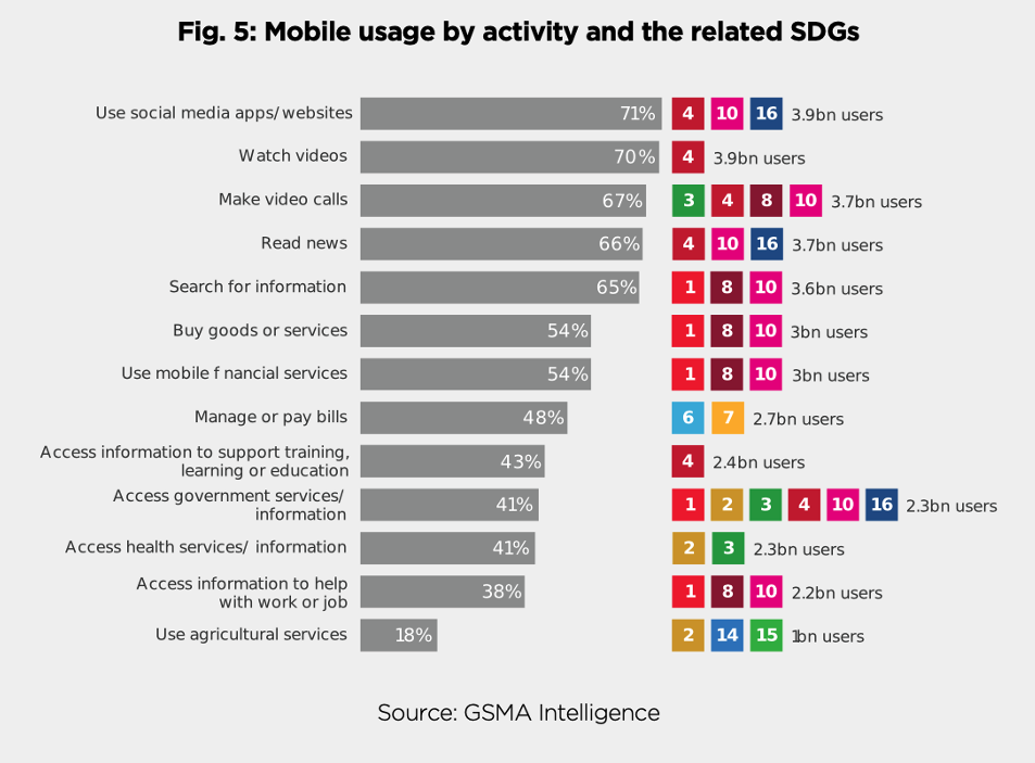 I progressi verso gli SDGs e come usiamo internet. Sono diversi gli Obiettivi di sviluppo sostenibile che beneficiano della crescita della telefonia mobile. L’impatto più elevato si registra nel Goal 9 (Imprese, innovazione e infrastrutture), che grazie allo sviluppo delle infrastrutture di reti mobili ha permesso l’accesso a internet, tra il 2015 e il 2023, a più di due miliardi di persone. Alla fine del 2023, continua il Rapporto, il 57% della popolazione mondiale (4,6 miliardi) utilizzava una connessione mobile e la quota di popolazione che viveva in aree senza copertura internet era solo del 4%. Attualmente il 54% degli utenti utilizza servizi finanziari online, che aiutano le persone a gestire le proprie finanze, creano opportunità di lavoro e aumentano la produttività. Impatto positivo sul Goal 1 (Sconfiggere la povertà) e il Goal 8 (Lavoro dignitoso e crescita economica). Sono stati fatti progressi anche nella riduzione delle disparità nell'accesso alla rete tra diversi segmenti di utenti, contribuendo al Goal 10 (Ridurre le disuguaglianze). Alla fine del 2023, la connessione nelle zone rurali ha raggiunto il 41% (1,4 miliardi di persone).