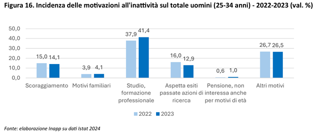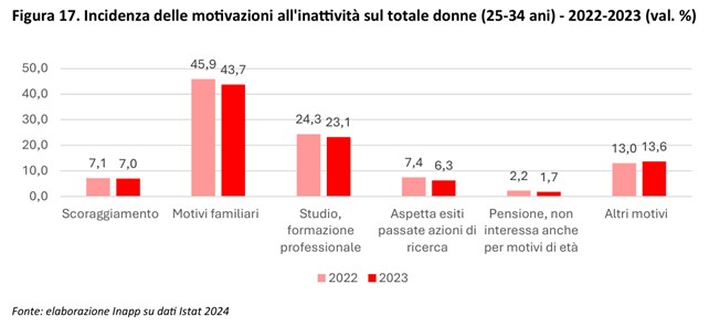 Mentre per gli uomini la principale causa di inattività è lo studio o la formazione, per le donne è il lavoro di cura. Soprattutto tra i 25-34 anni di età: in questa fascia il 43,7% delle donne non lavora per questo motivo, contro appena il 4% degli uomini.