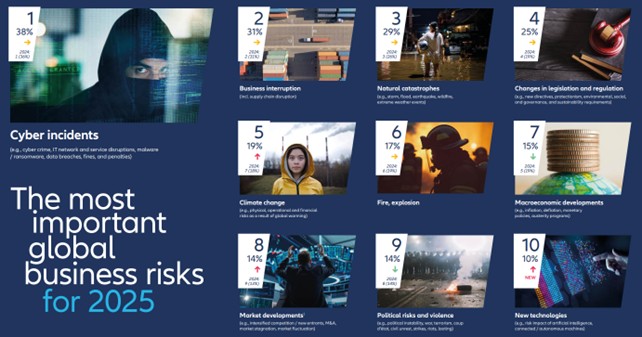 Attacchi informatici, interruzione dell’attività lavorativa e catastrofi naturali in cima alla top 10. In un contesto in cui i potenziali pericoli sono sempre più interconnessi, serve un approccio olistico alla gestione del rischio. 6/2/25