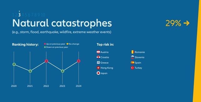 3. Sul gradino più basso del podio ci sono le catastrofi naturali, che per il quinto anno consecutivo hanno causato perdite economiche che superano i 100 miliardi di dollari. Le catastrofi sono il rischio principale in 9 Paesi: Austria, Croazia, Grecia, Hong Kong, Giappone, Romania, Slovenia, Spagna, Turchia. In Italia è al secondo posto.