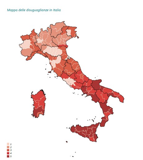 Una geografia delle disparità (e delle opportunità) molto complessa. Oltre la tradizionale contrapposizione tra il Nord Italia sviluppato e il Mezzogiorno arretrato. È quella che emerge dal rapporto “Italia (ancora) diseguale” pubblicato recentemente dalla Fondazione Friedrich Ebert, che ha analizzato le 107 province italiane andando oltre il Pil e considerando sei indicatori diversi: economia e mercato del lavoro, capitale umano, demografia, servizi, qualità della vita e capitale civico.