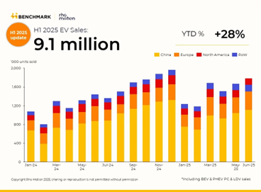 Il numero di veicoli elettrici venduti a livello globale nella prima metà del 2025 è stato pari a 9,1 milioni. Sebbene la crescita non sia omogenea, sottolinea l’analisi di mercato diffusa il 15 luglio da Rho motion, si tratta di un dato che descrive un settore in buona salute: il mercato delle Bev (Battery electric vehicle) è infatti cresciuto del 24% su base annua a giugno 2025 (rispetto a giugno 2024) e del 7% rispetto a maggio 2025.