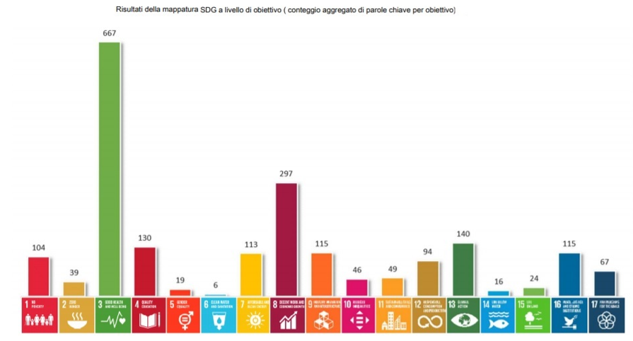 Riassumendo le principali evidenze a livello di SDGs, il piano nel suo insieme affronta prevalentemente le tematiche relative al Goal 3 “Salute e benessere” (667 volte, 32% del totale) e al Goal 8 “Lavoro dignitoso e crescita economica” (297 volte, 14% del totale), ma integra molti altri Obiettivi tra cui il 13 (clima), il 4 (Istruzione di qualità), il 16 (Pace, giustizia e istituzioni forti) e il 9 (Imprese, innovazione e infrastrutture). Non sfugge all’analisi del Jrc che alcuni Goal, come il 6 sulle risorse idriche, sono affrontati solo marginalmente.
