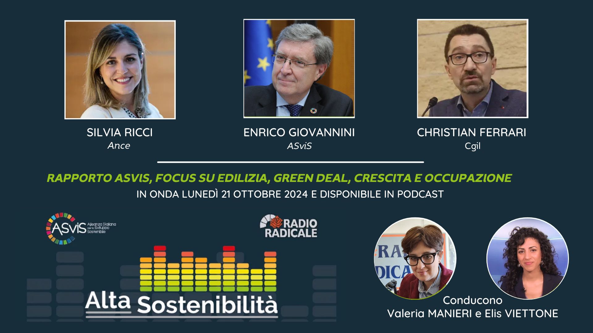 Ad Alta sostenibilità, in onda lunedì 21 ottobre alle 12.30, su Radio Radicale e disponibile in podcast. Ospiti: Christian Ferrari, segretario confederale della Cgil; Enrico Giovannini, direttore scientifico dell’ASviS; Silvia Ricci, Associazione nazionale costruttori edili. In studio Valeria Manieri ed Elis Viettone.